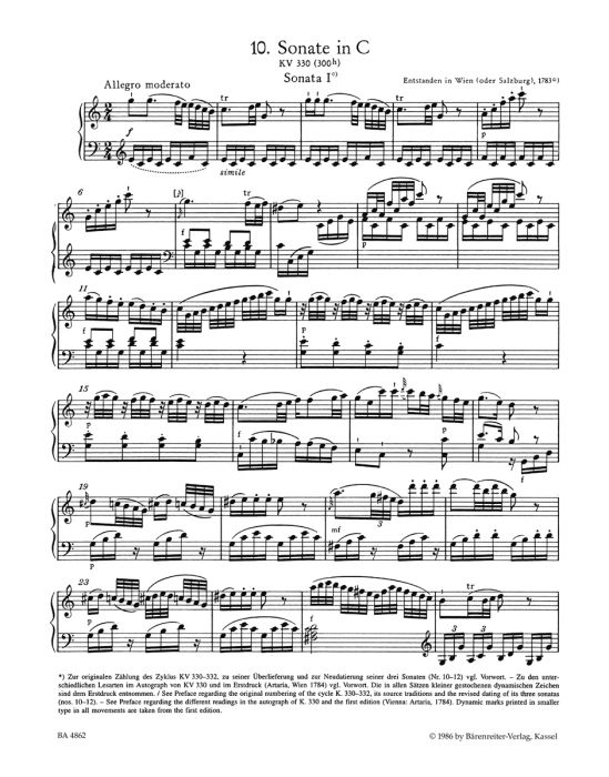 Η παρούσα δίτομη έκδοση των σονάτων για πιάνο του Μότσαρτ περιλαμβάνει στην αυθεντική τους παρτιτούρα όλα τα μέχρι τώρα γνωστά έργα του Μότσαρτ, δηλαδή δεκαοκτώ έργα στο κύριο σώμα και μια ποικιλία εναλλακτικών εκδοχών και ημιτελών σονάτων στα Παραρτήματα. Η έκδοση περιλαμβάνει όλες τις σωζόμενες πηγές. K.330-333,457,475,533+494,545,570576
