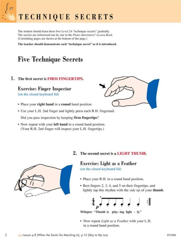 Το βιβλίο “Τεχνικής & Καλλιτεχνίας” Επιπέδου 2Α της 2ης Έκδοσης από τη σειρά Faber Piano Adventures περιλαμβάνει αποτελεσματικές ασκήσεις το “Μυστικό της Τεχνικής” που εκπαιδεύουν τους μαθητές σε σταθερά δάχτυλα, ελαφρύ αντίχειρα, γρήγορα δάχτυλα, συντονισμό των χεριών μαζί και αιώρηση του καρπού. Ένα κομμάτι “Μαγεία Καλλιτεχνίας” στο τέλος κάθε ενότητας εξερευνά το εκφραστικό παίξιμο.