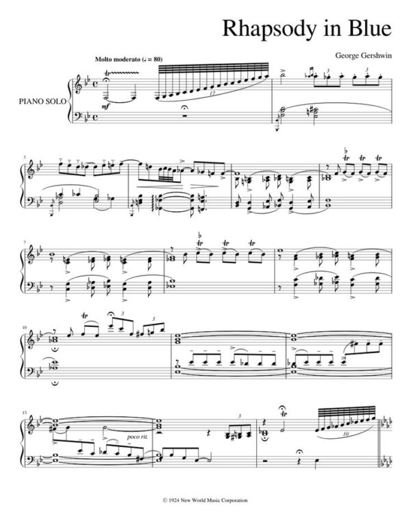 Το Rhapsody in Blue έκανε την πρεμιέρα του σε μια συναυλία με τίτλο «An Experiment in Modern Music» που πραγματοποιήθηκε στις 12 Φεβρουαρίου 1924 στο Aeolian Hall της Νέας Υόρκης, από τον Paul Whiteman και το συγκρότημά του με τον Gershwin να παίζει πιάνο. Αυτή η έκδοση είναι για σόλο πιάνου και έγινε από τον ίδιο τον συνθέτη το 1927.